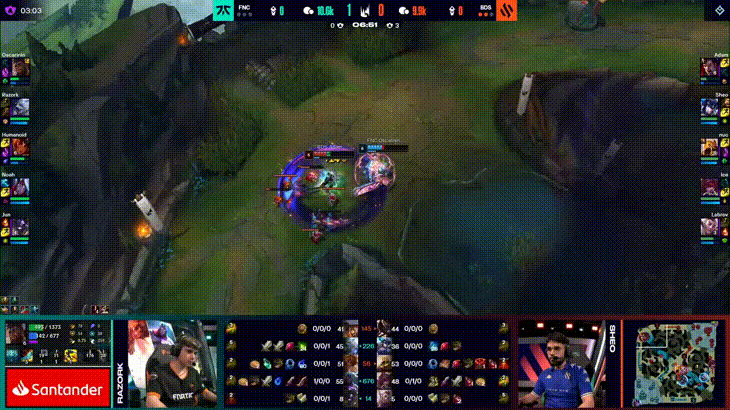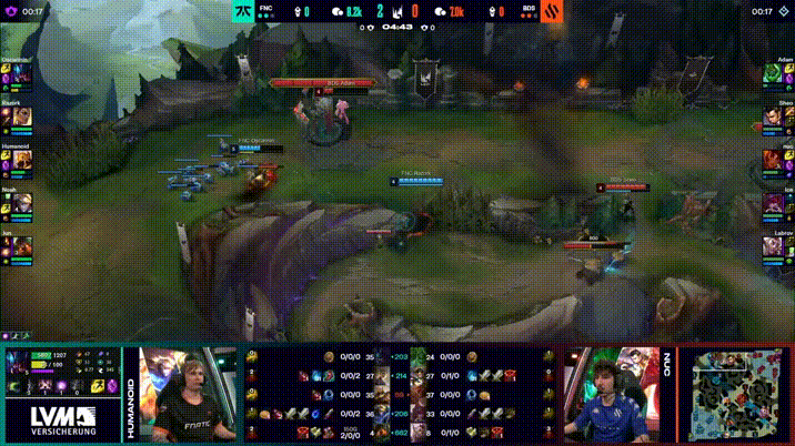 LEC败决第五局,FNC二打一越塔被Adam扎克反杀一人