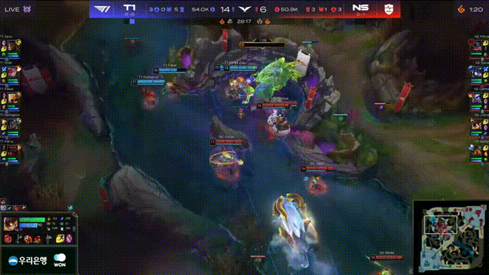 LCK:大龙混战Faker沙皇及时救场,T1打出1换5团灭NS拿大龙