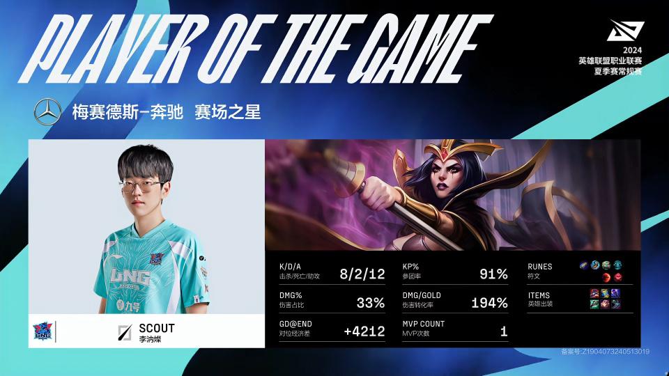 FoFo飞机砍下10/0/5超神战绩,拿到LGD对战WE第一局MVP