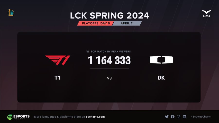 T1对阵DK系列赛创下1.16M收视率,本赛季LCK收视率第二名