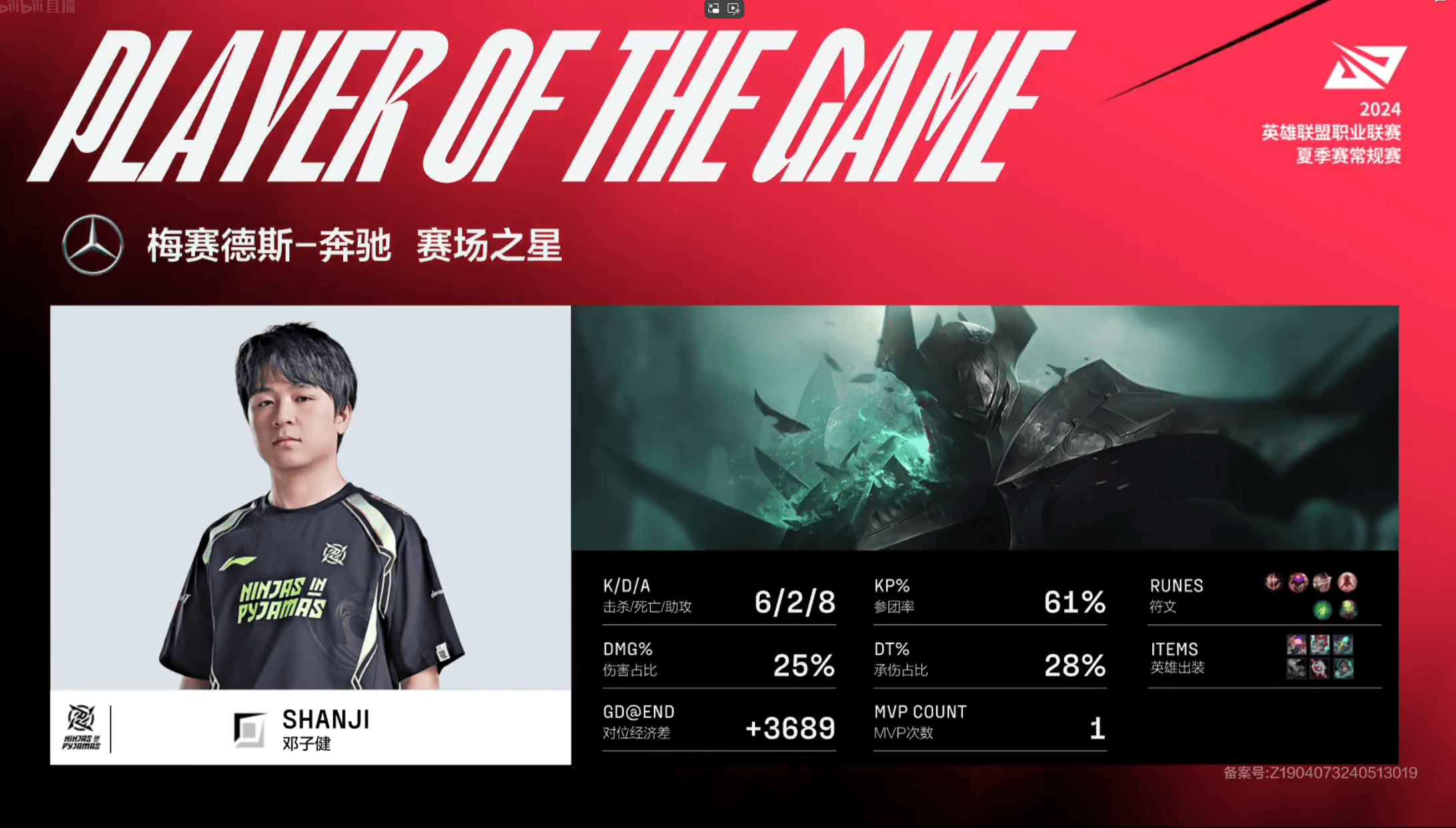 shanji铁男打出6/2/8的战绩,拿到IG对阵NIP首局比赛的MVP