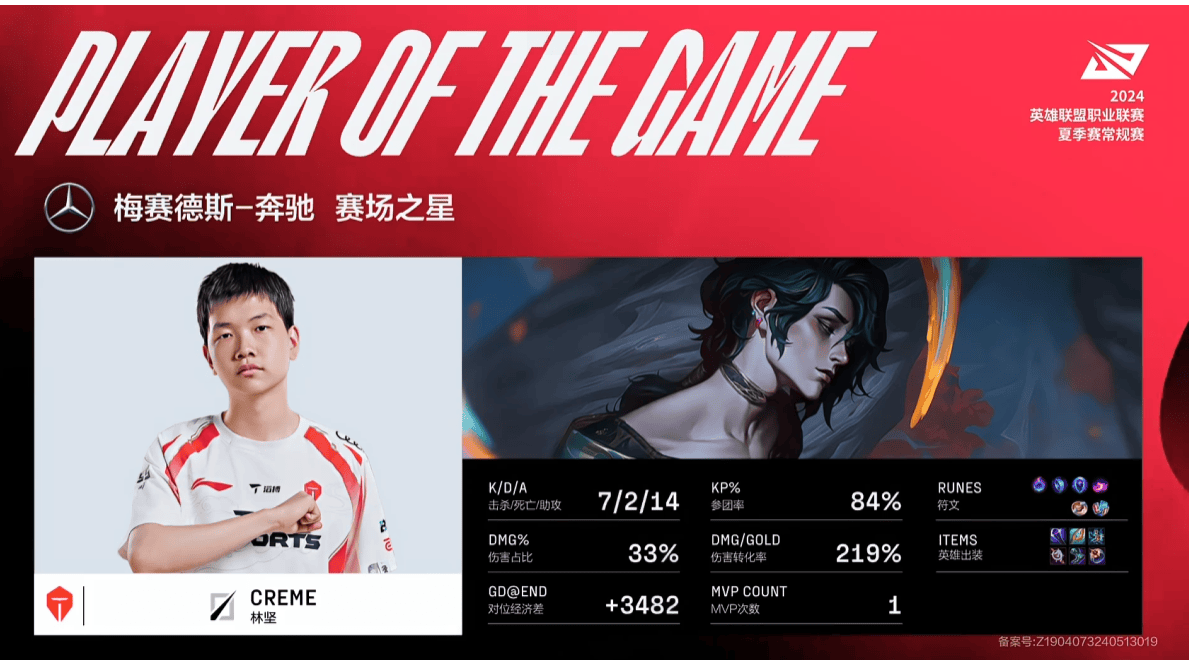 Creme慧打出7/2/14的战绩,拿到TES对阵RA首局MVP