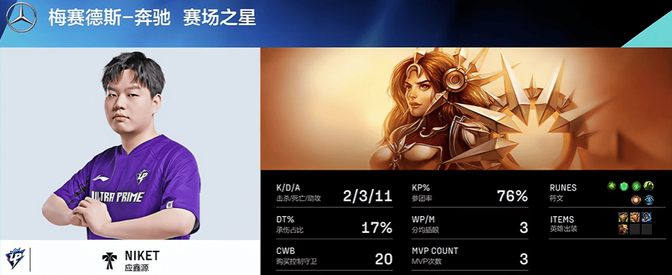 Niket蕾欧娜打出2/3/11战绩,拿下UP对阵AL第一局MVP