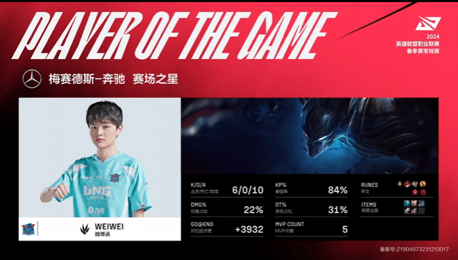 Weiwei梦魇砍下6/0/10战绩,拿到LNG对阵IG首局比赛MVP
