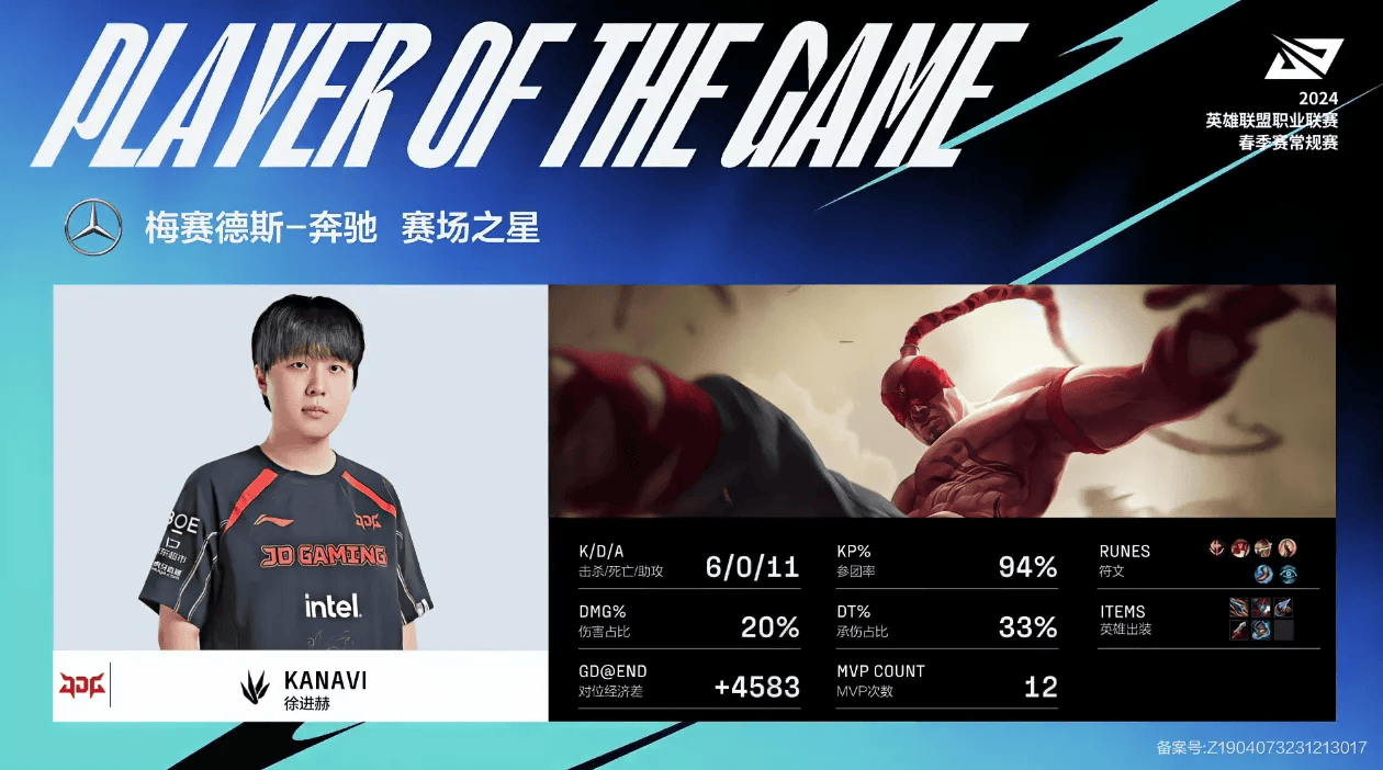 Kanavi盲僧打出6/0/11战绩,拿到JDG对阵AL第二局MVP