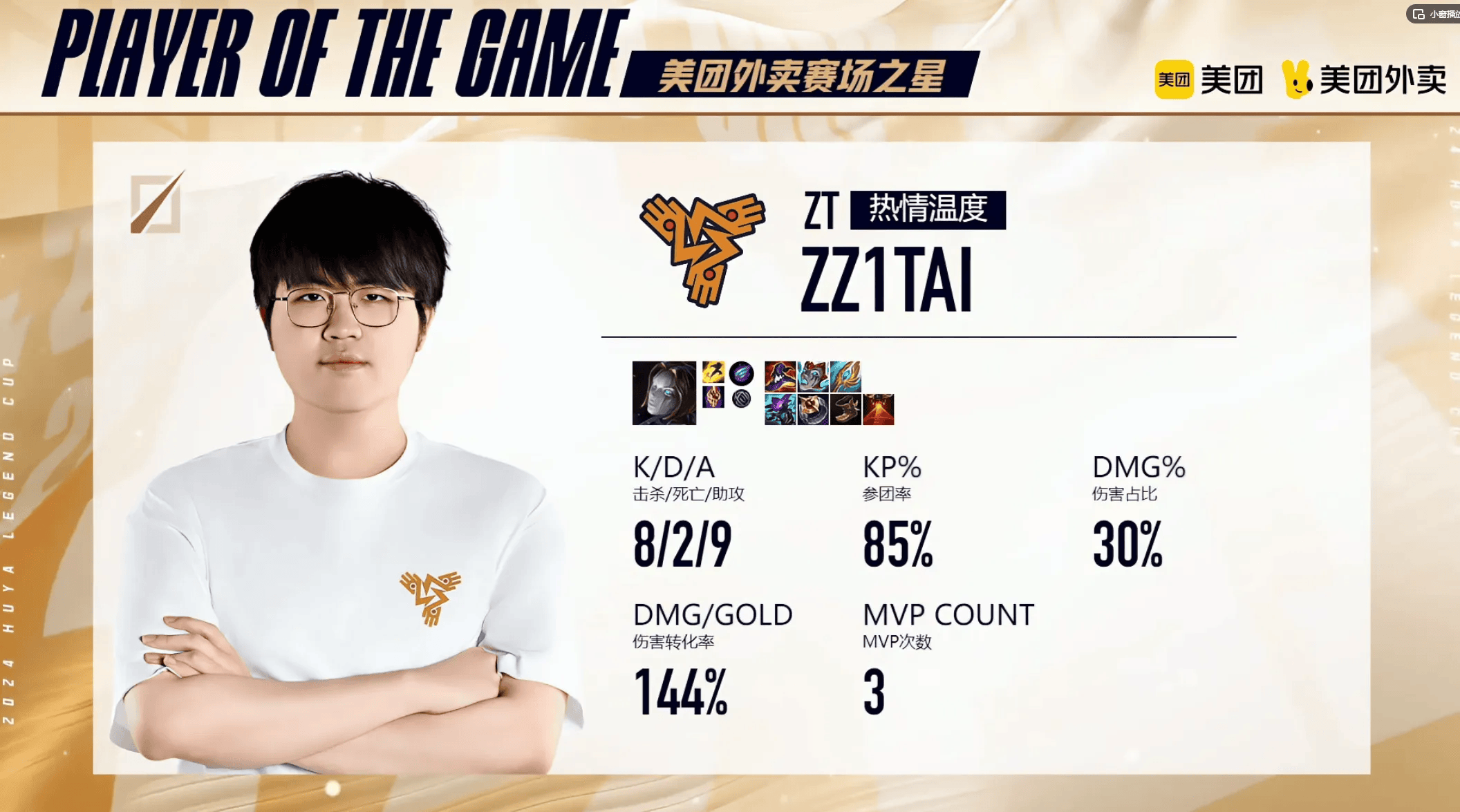 Zz1tai发条打出8/2/9的战绩,拿到BGM对阵ZT的MVP