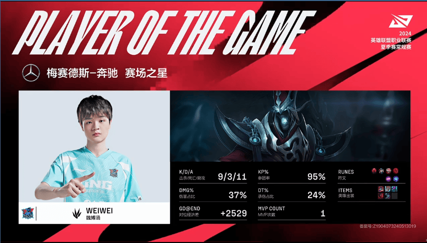 Weiwei死歌打出9/3/11战绩,拿到LNG对阵RA首局MVP