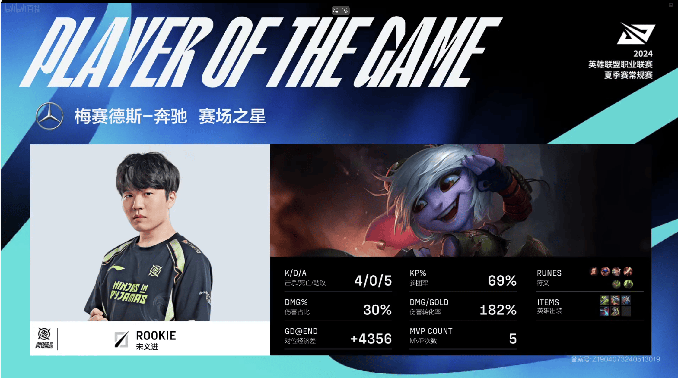 Rookie小炮打出4/0/5的战绩,拿到NIP对阵WBG首局比赛的MVP