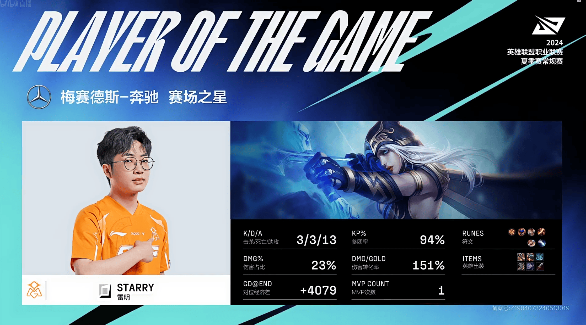 Starry艾希打出3/3/13的战绩,拿到LNG对阵OMG次局比赛的MVP