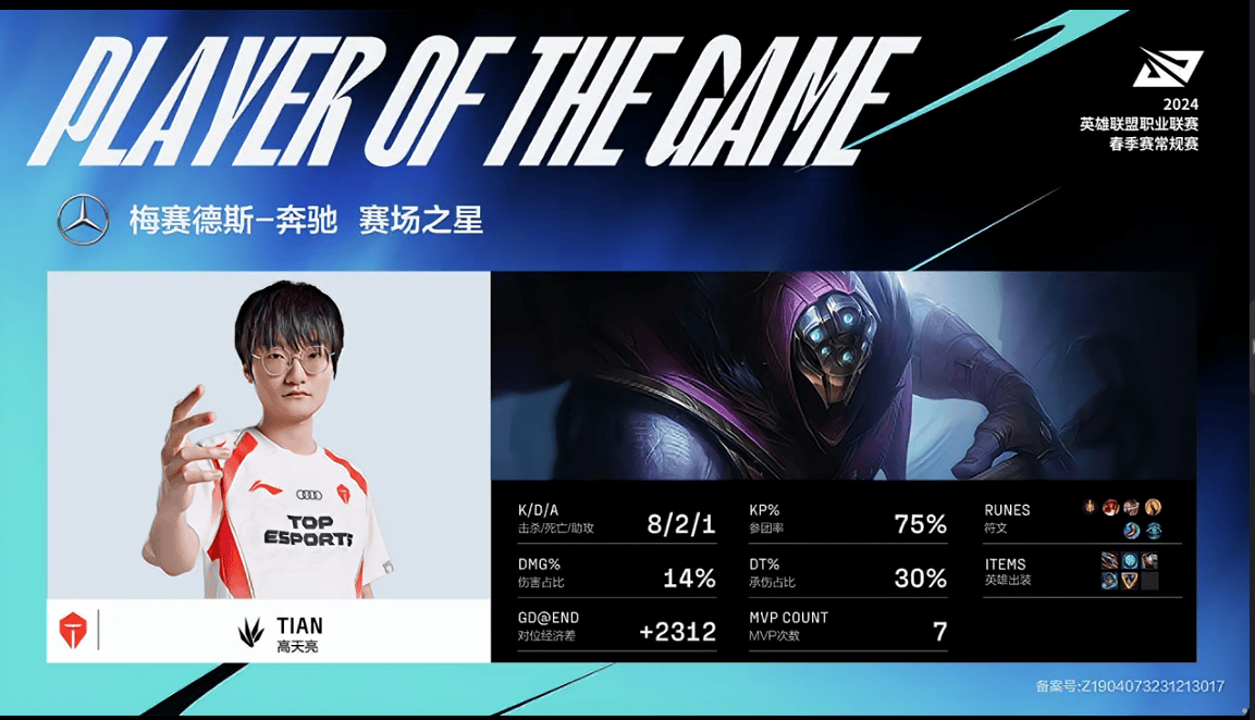 Tian武器打出8/2/1的战绩,拿下TES对阵TT次局MVP