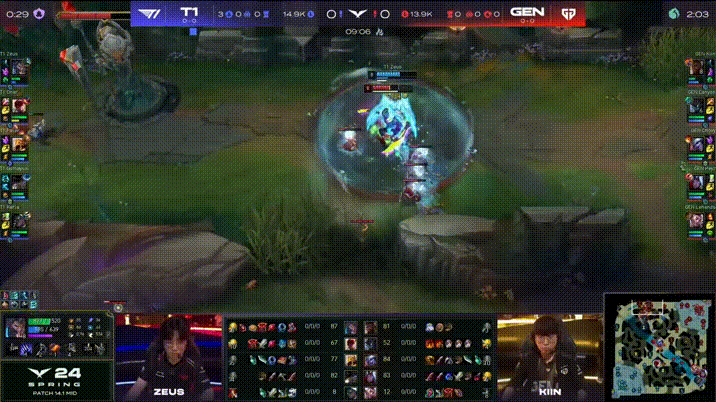 Keria赛娜大招精准救场!Zeus乌迪尔一打二反杀Kiin奎桑提