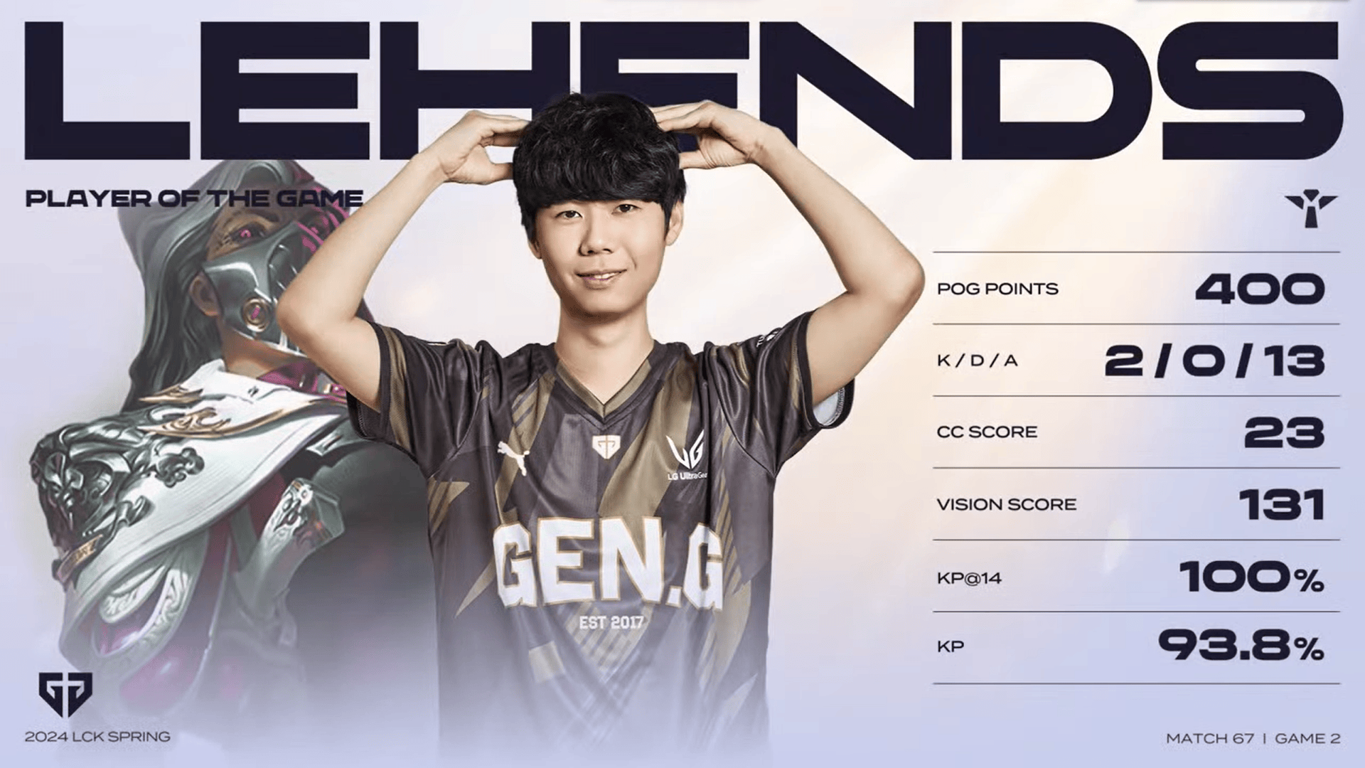 Lehends烈娜塔打出2/0/13的战绩,拿下GEN对阵T1次局MVP