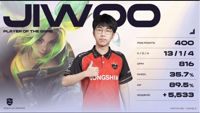 Jiwoo泽丽砍下13/1/4战绩,拿到NS对阵KT次局比赛MVP