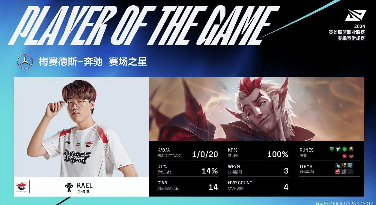 Kael洛拿到1/0/20战绩,拿到AL对阵JDG首局MVP