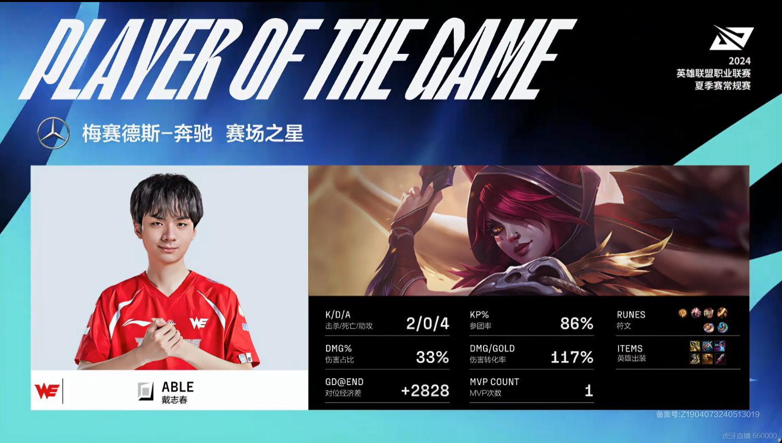 Able霞砍下2/0/4的战绩,拿下RNG对阵WE次局MVP