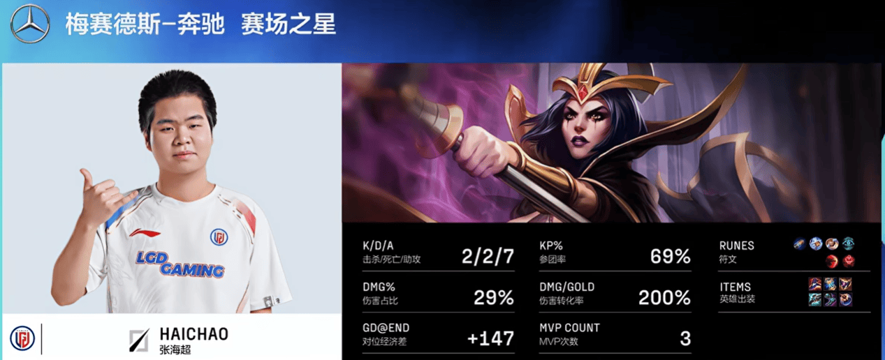 haichao乐芙兰打出2/2/7战绩,拿下LGD对阵BLG第三局MVP
