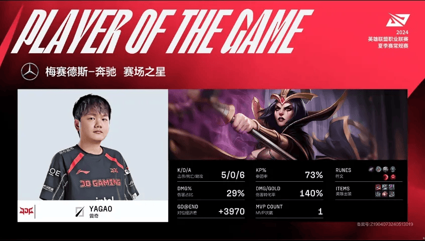 Yagao妖姬打出5/0/6战绩,拿到JDG对阵EDG第一局MVP