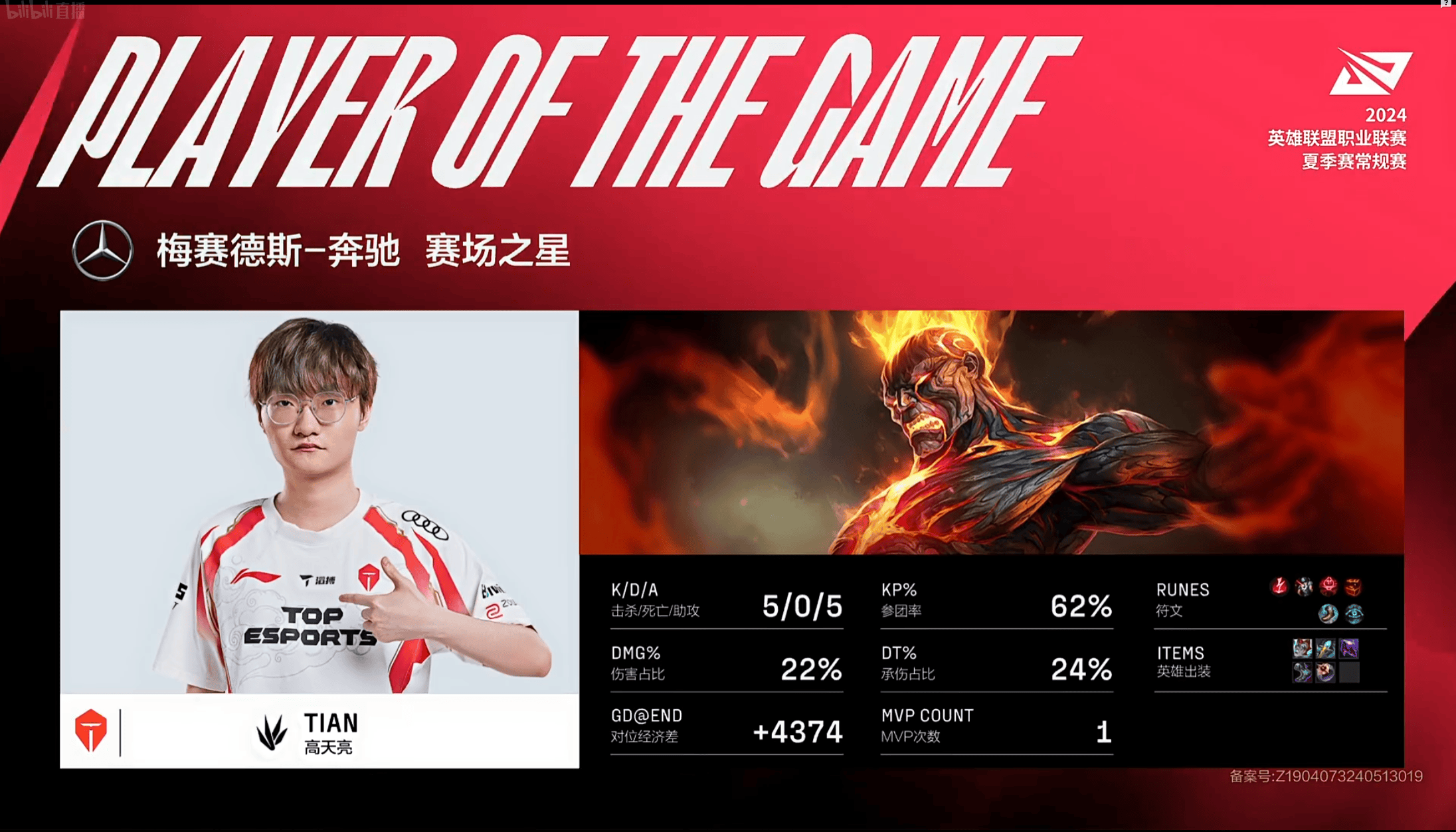 Tian火男打出5/0/5的战绩,拿到LNG对阵TES首局的MVP