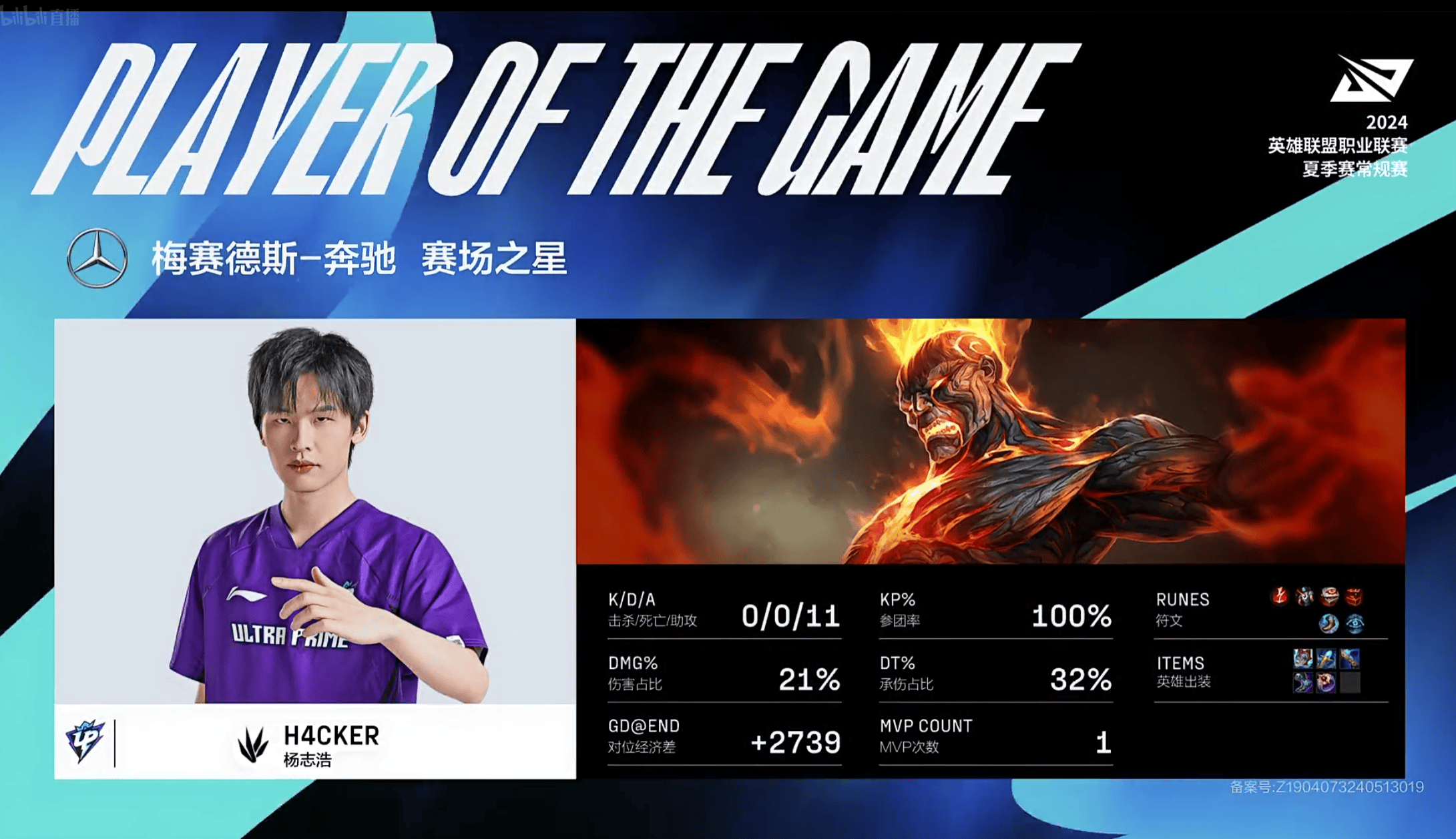 H4cker火男打出0/0/11的战绩,拿到UP对阵WBG首局比赛的MVP