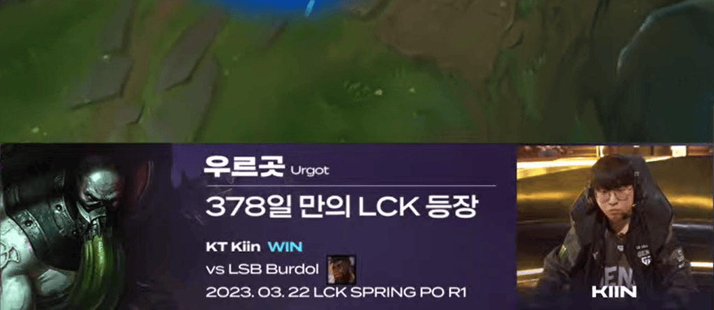 上单厄加特时隔378天再度登上LCK赛场,由GEN上单Kiin选出