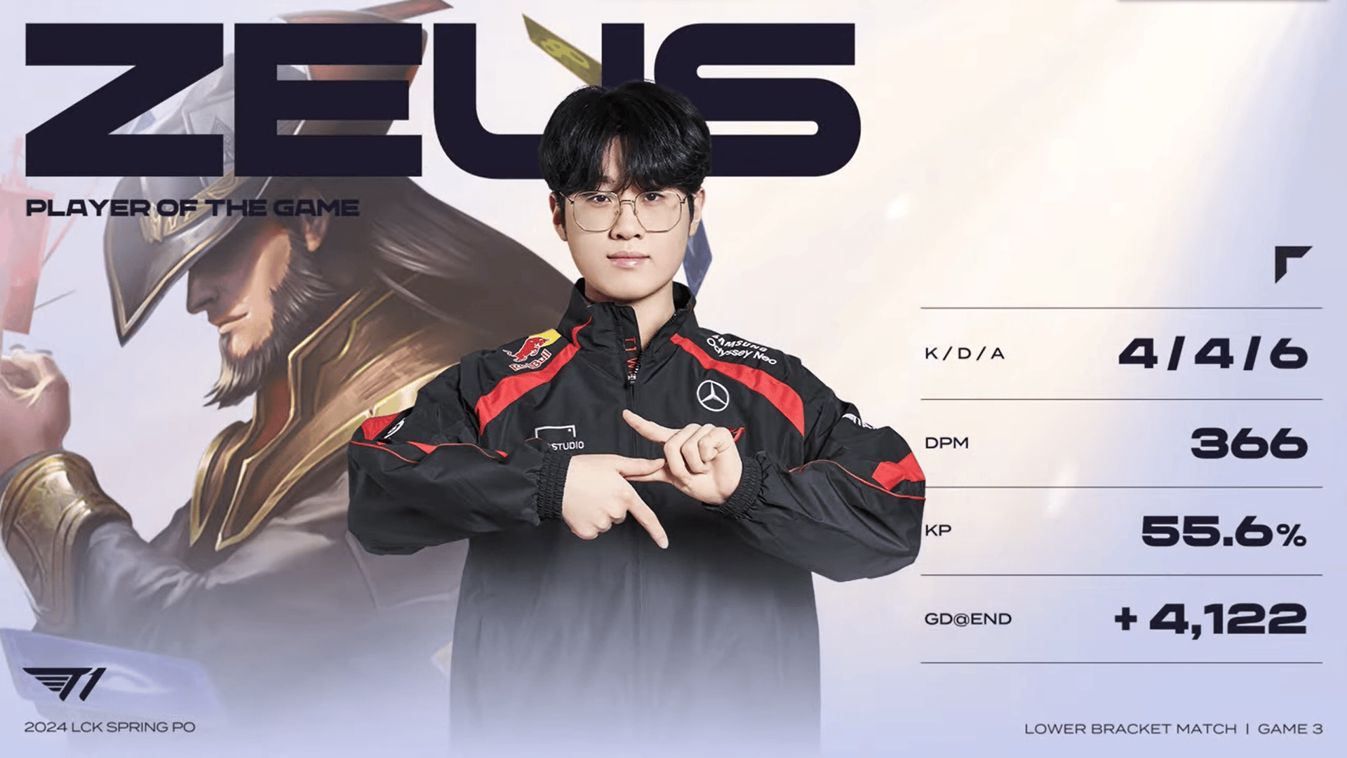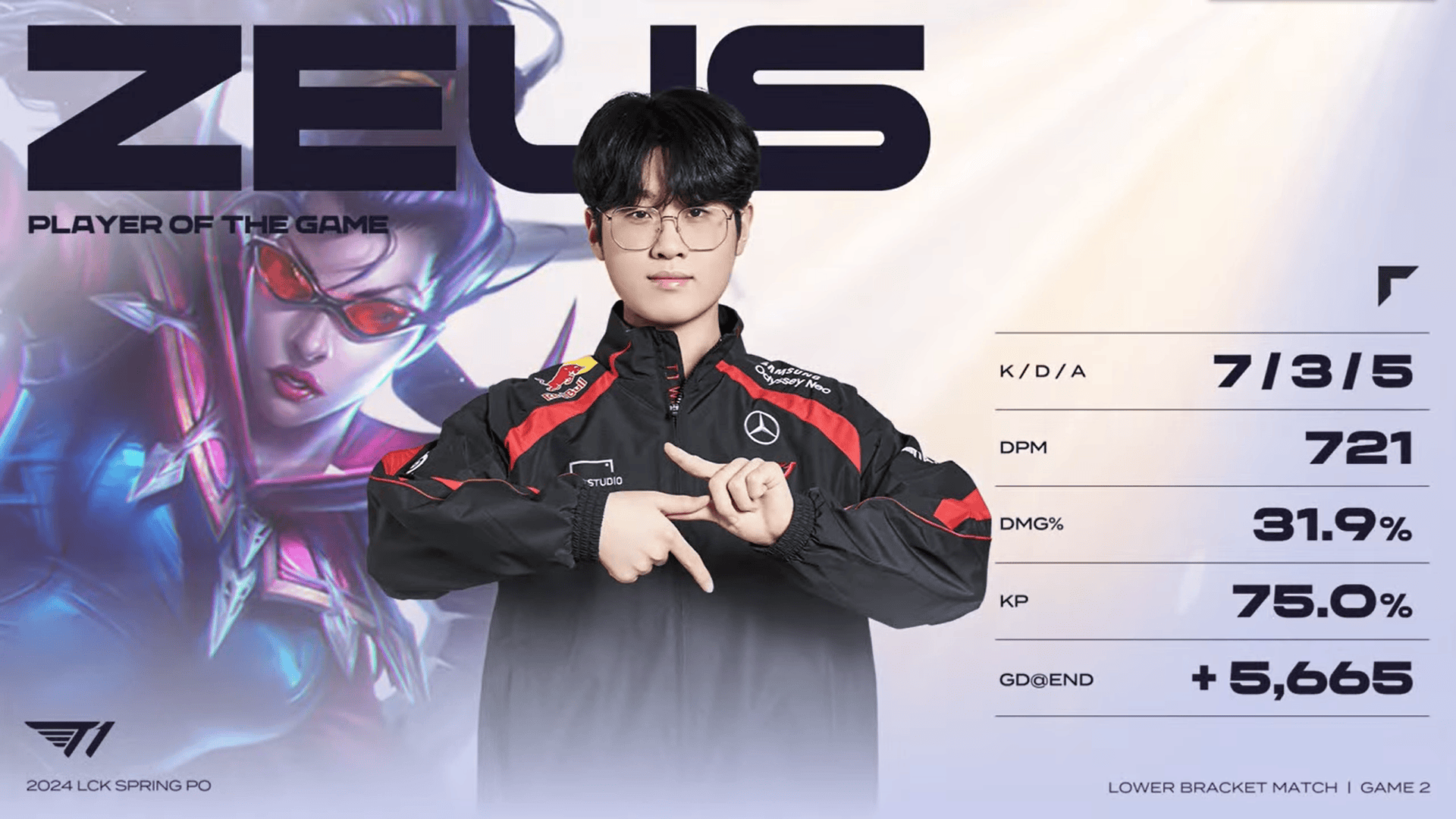 Zeus薇恩砍下7/3/5的战绩,拿下T1对阵DK次局MVP