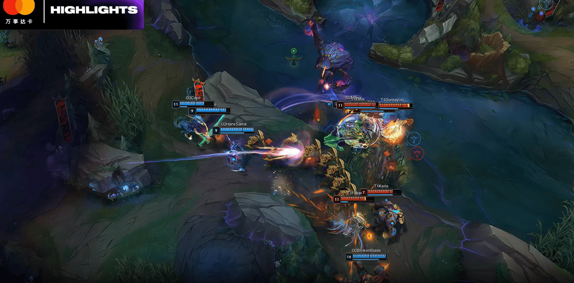 Zeus中路游走闪现开大,配合Faker击杀Caps乐芙兰