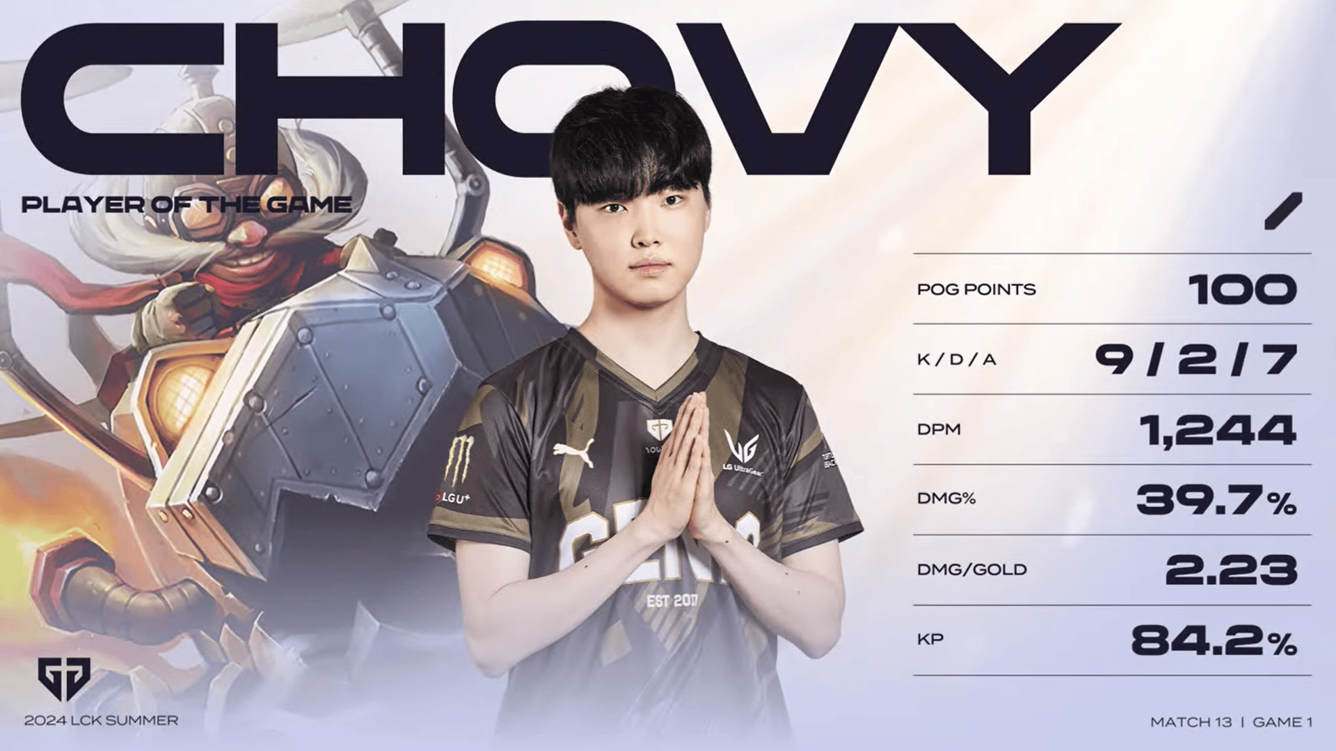 Chovy飞机砍下9/2/7的战绩,拿下GEN对阵KT首局MVP