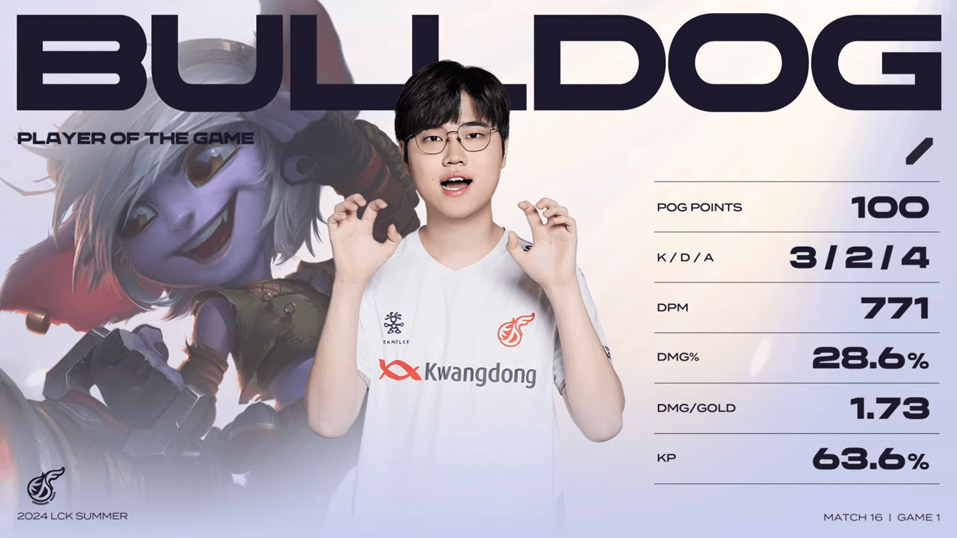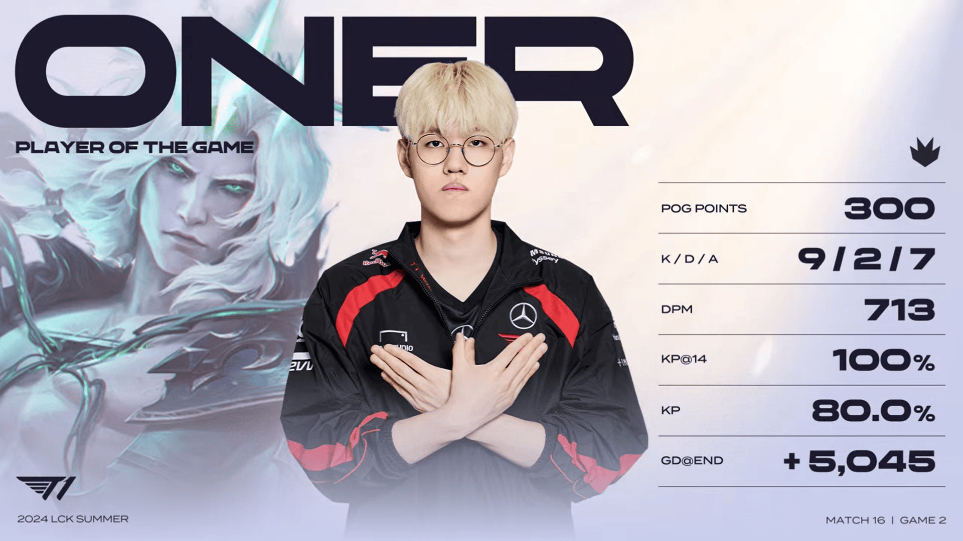 Oner佛耶戈砍下9/2/7的战绩,拿下T1对阵KDF次局MVP