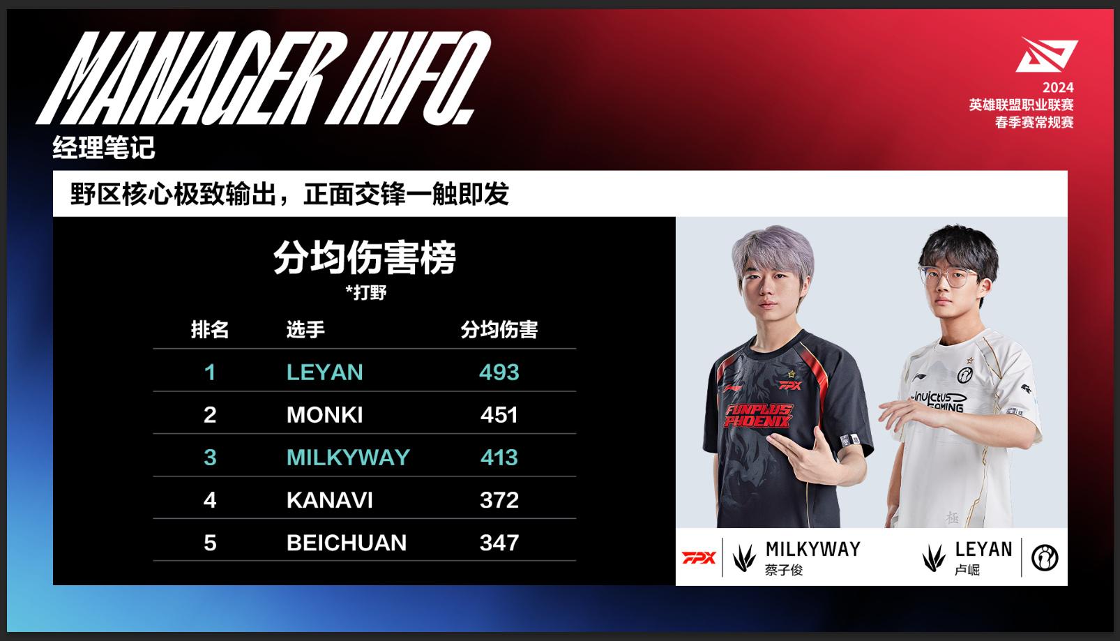本赛季打野分均伤害榜:Leyan与milkyway分别位列第一、三名
