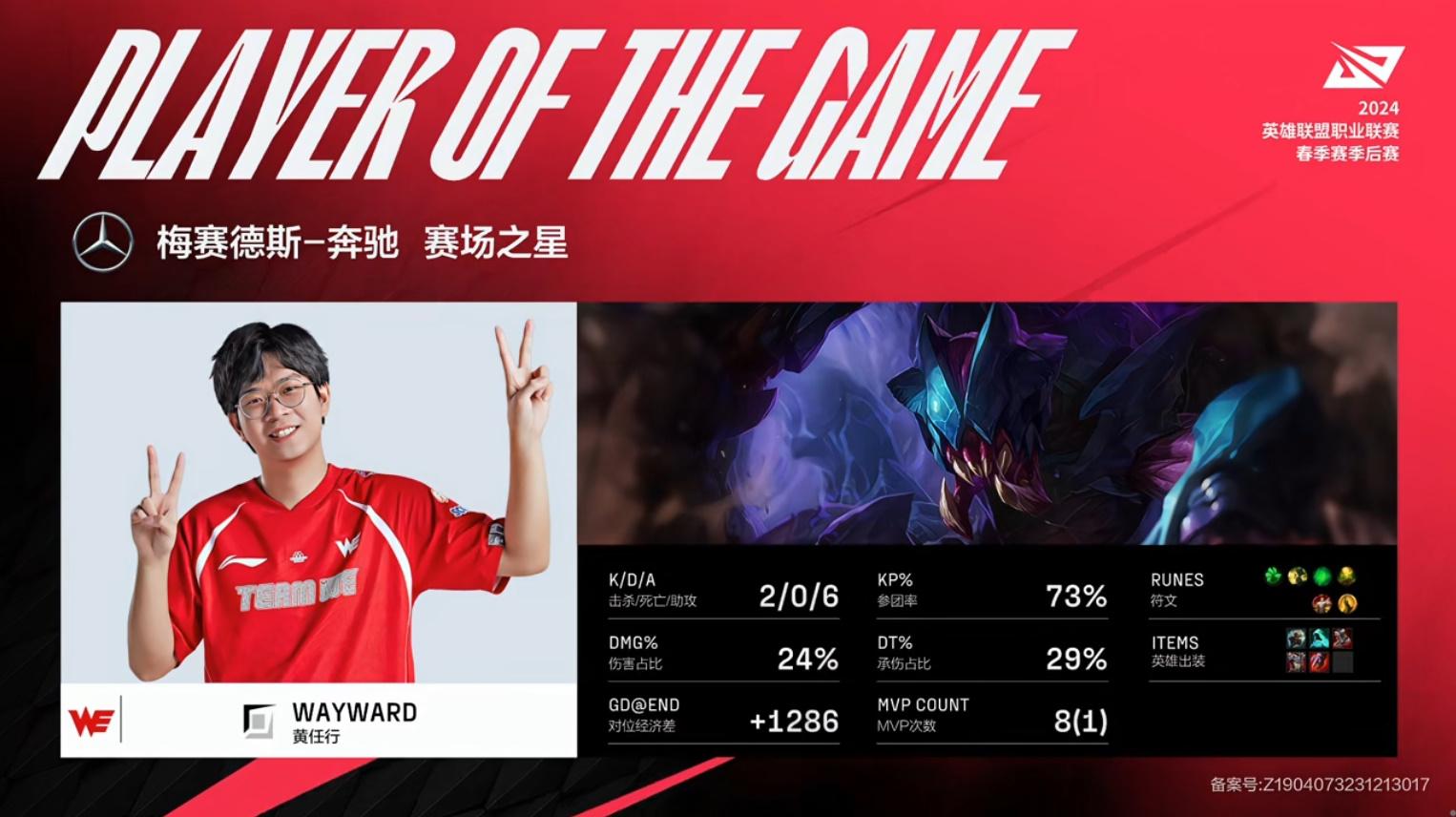 Wayward雷克塞砍下2/0/6战绩,拿到NIP对战WE第三局MVP