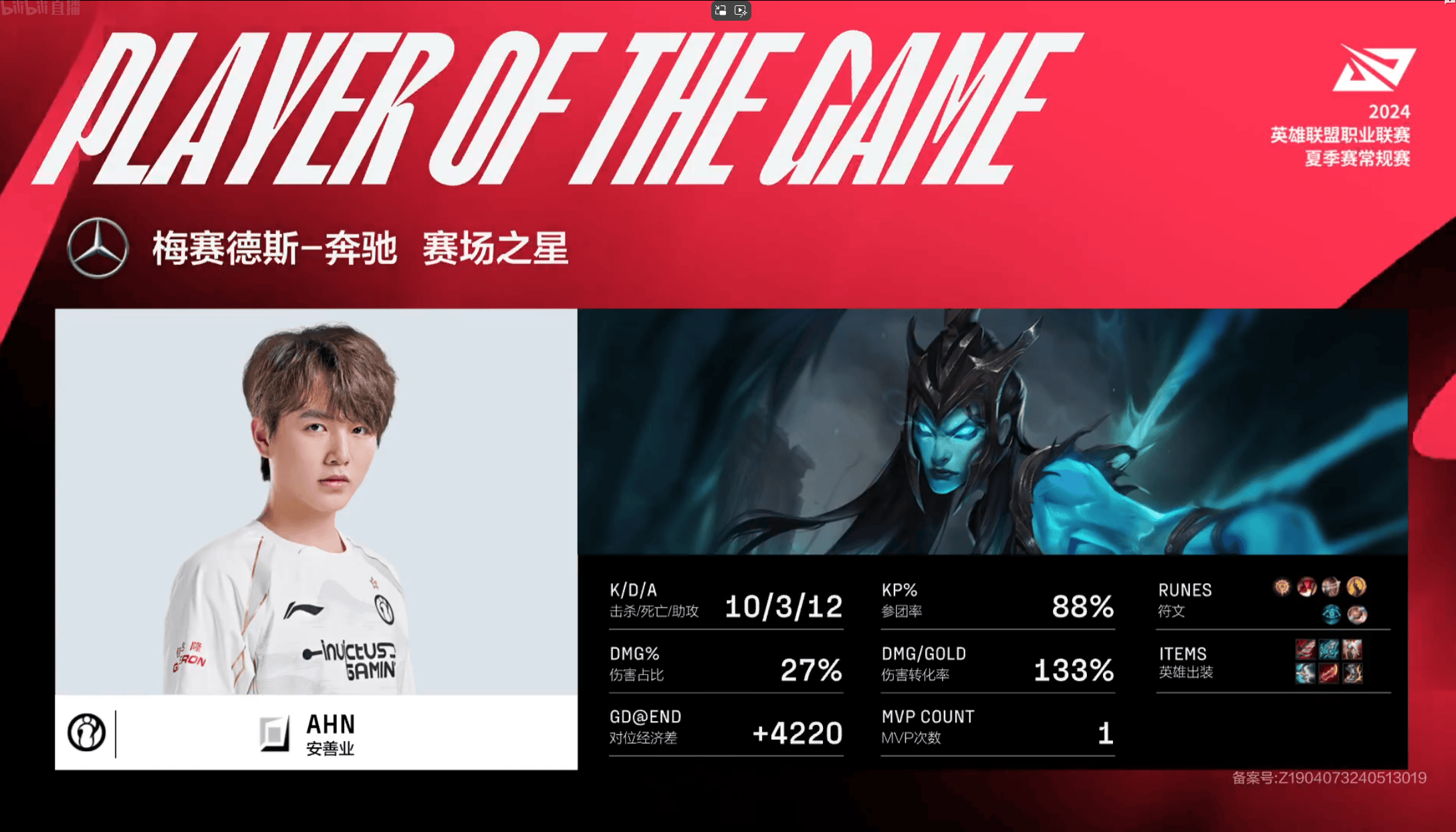 Ahn滑板鞋打出10/3/12的战绩,拿到IG对阵NIP次局比赛的MVP