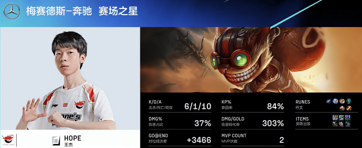 Hope炸弹人打出6/1/10战绩,拿下AL对阵IG第一局MVP