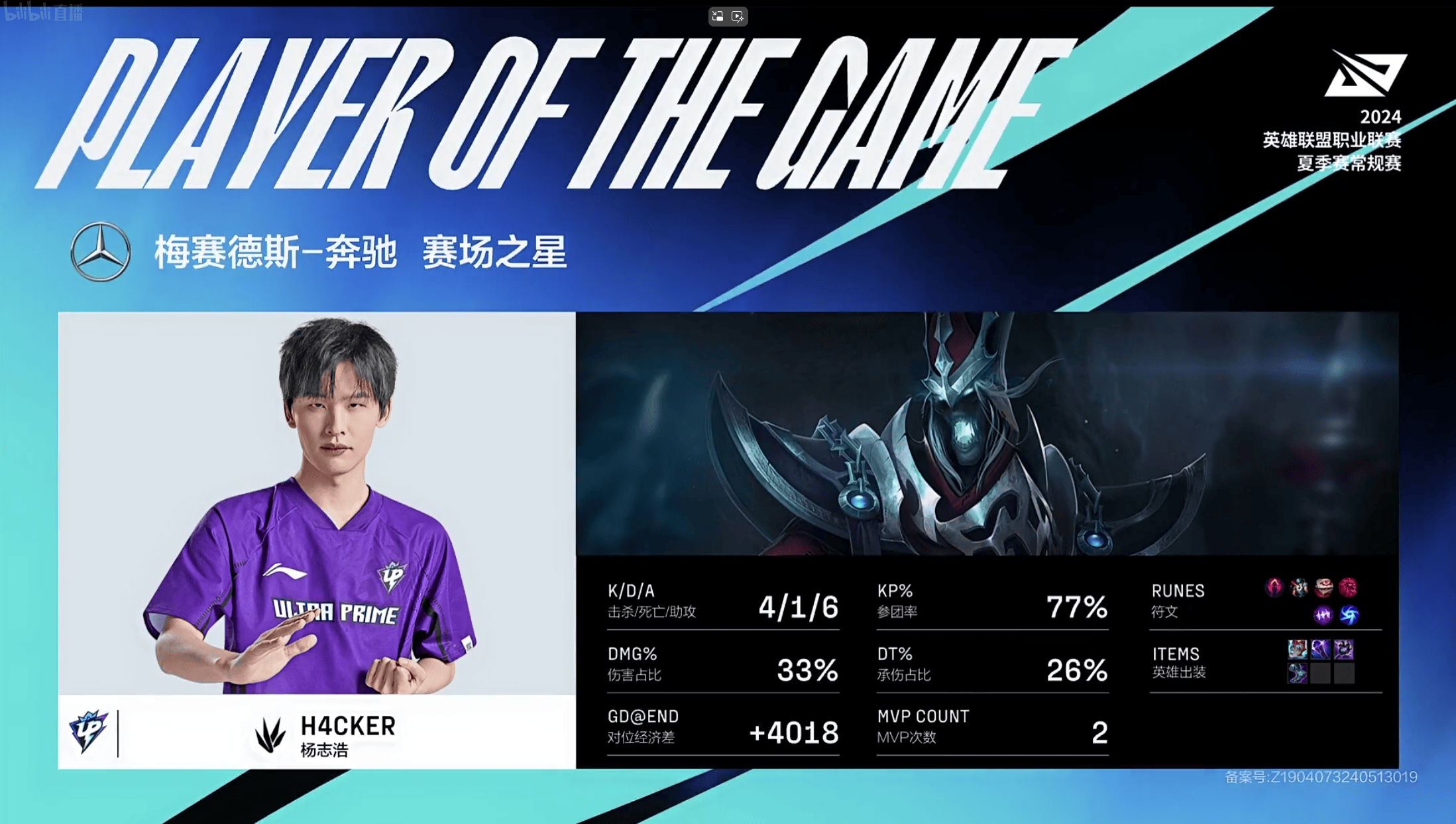 H4cker死歌打出4/1/8的战绩,拿到UP对阵WBG决胜局的MVP