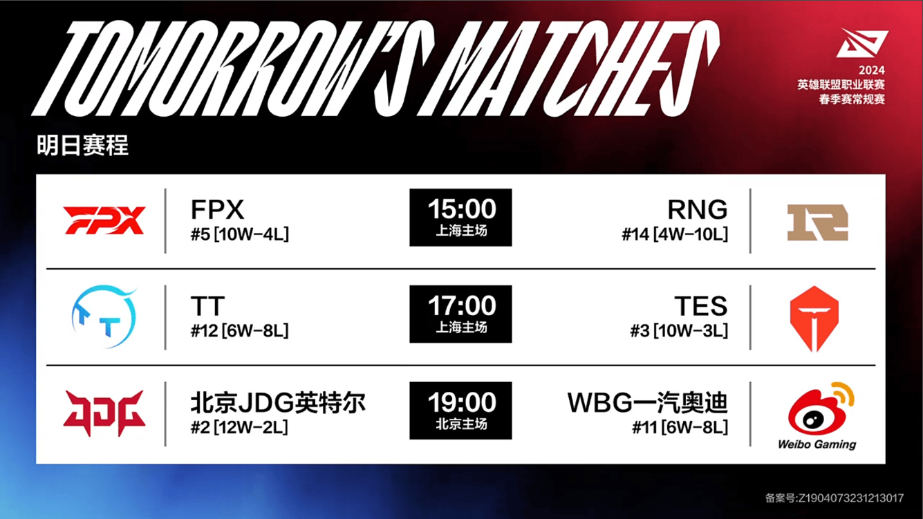 LPL春季赛W8D5虎扑墙:FPX vs RNG、TT vs TES、JDG vs WBG