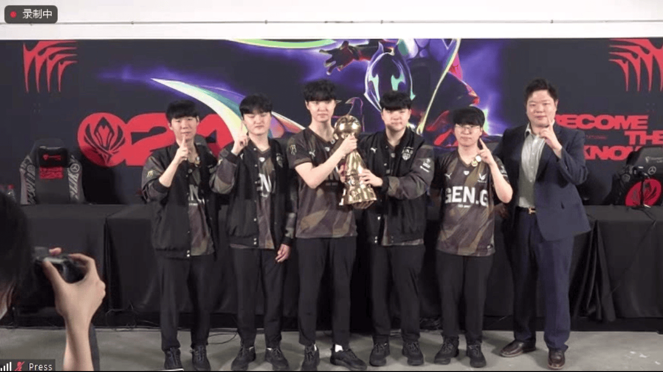 群访结尾GEN与MSI奖杯合影,中野负责举起奖杯