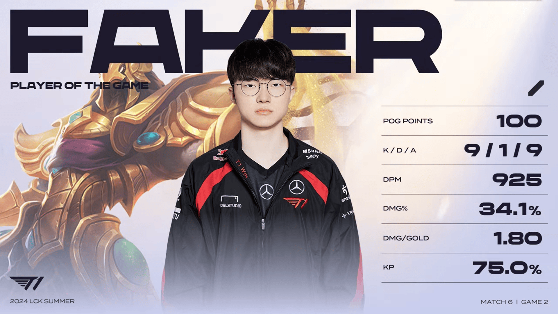 Faker沙皇砍下9/1/9的战绩,拿下T1对阵NS次局MVP