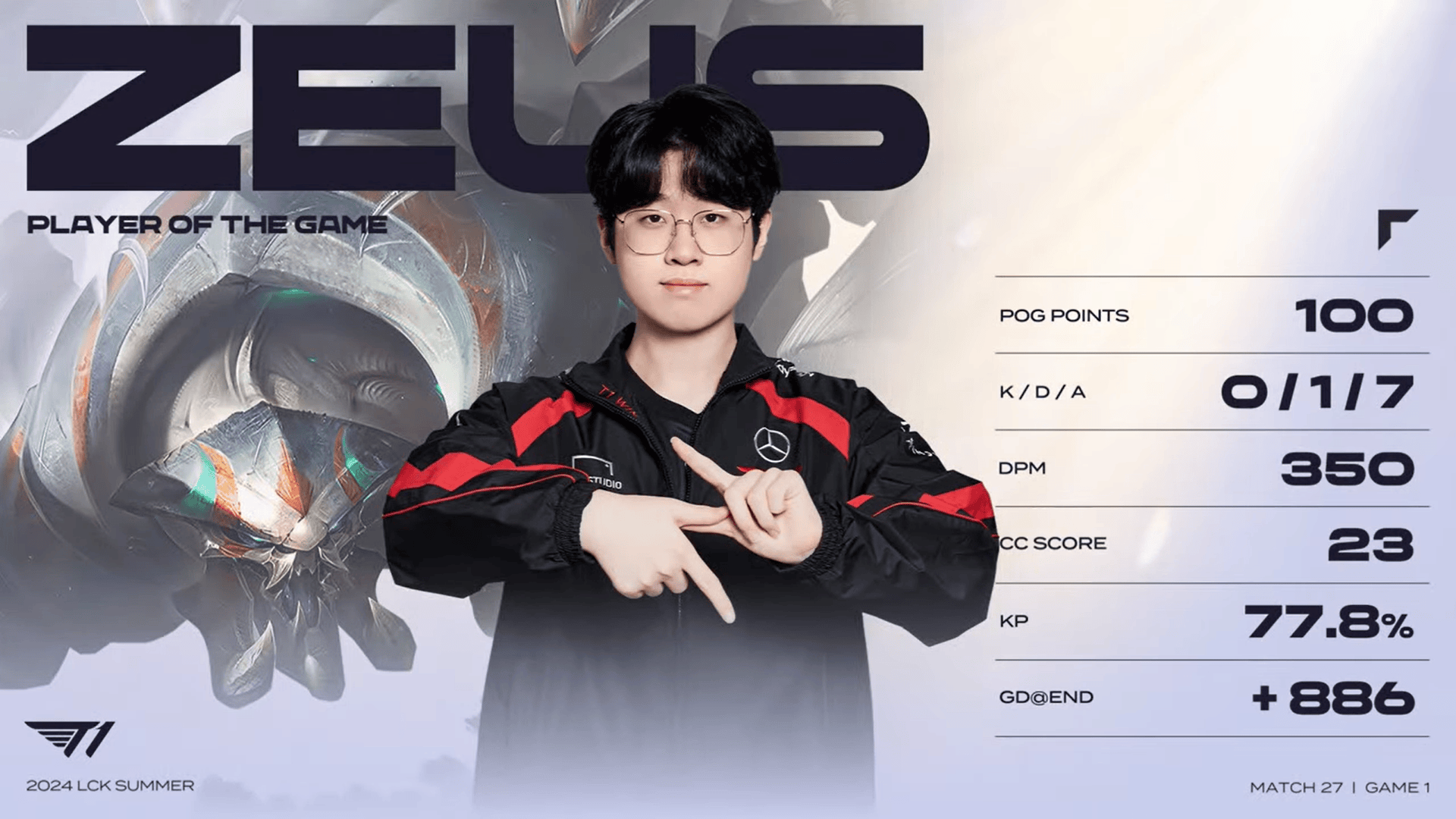Zeus蝎子砍下0/1/7的战绩,拿下T1对阵KT首局MVP