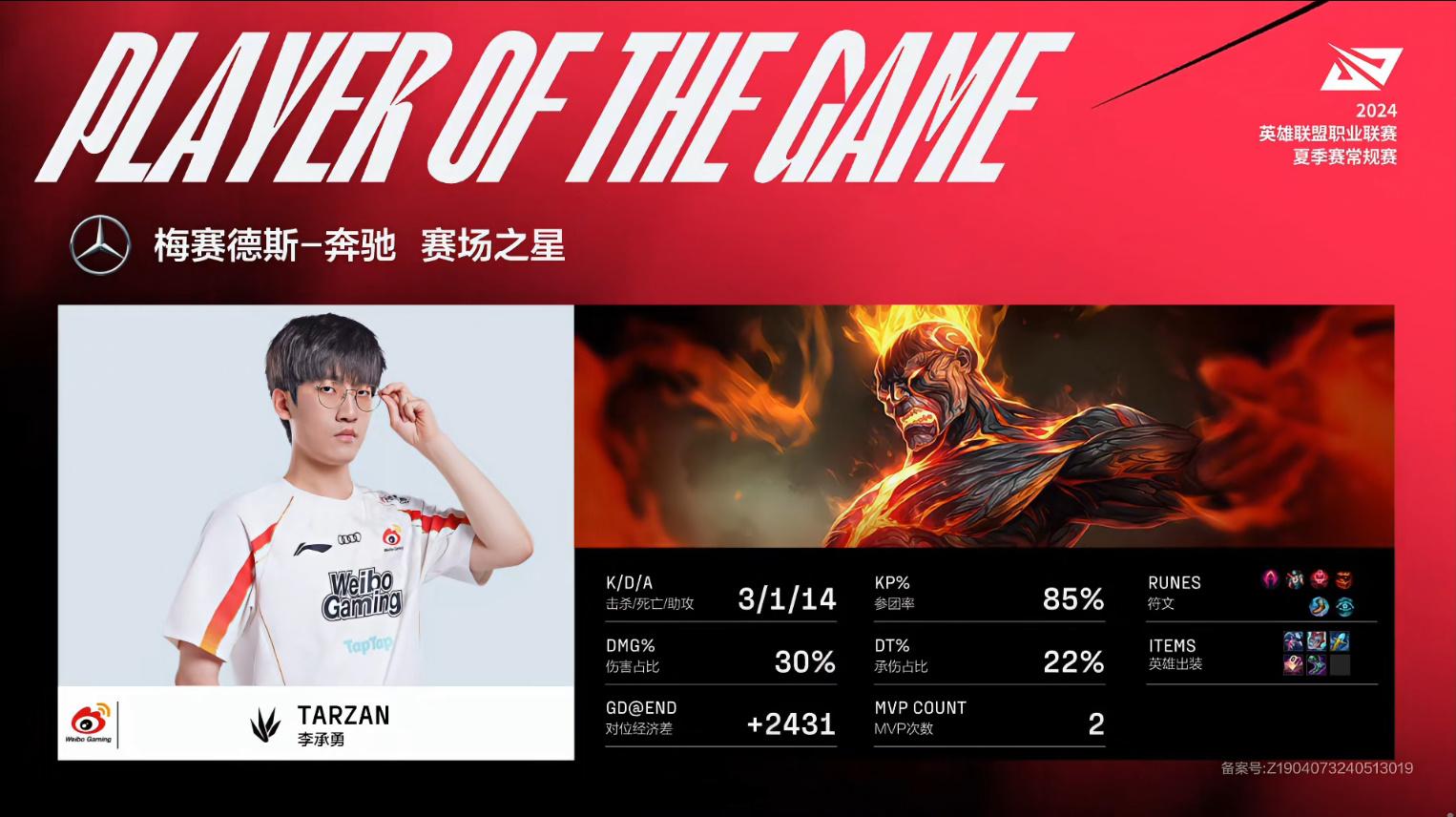 Tarzan火男打出3/1/14战绩,拿下AL对阵WBG第一局MVP