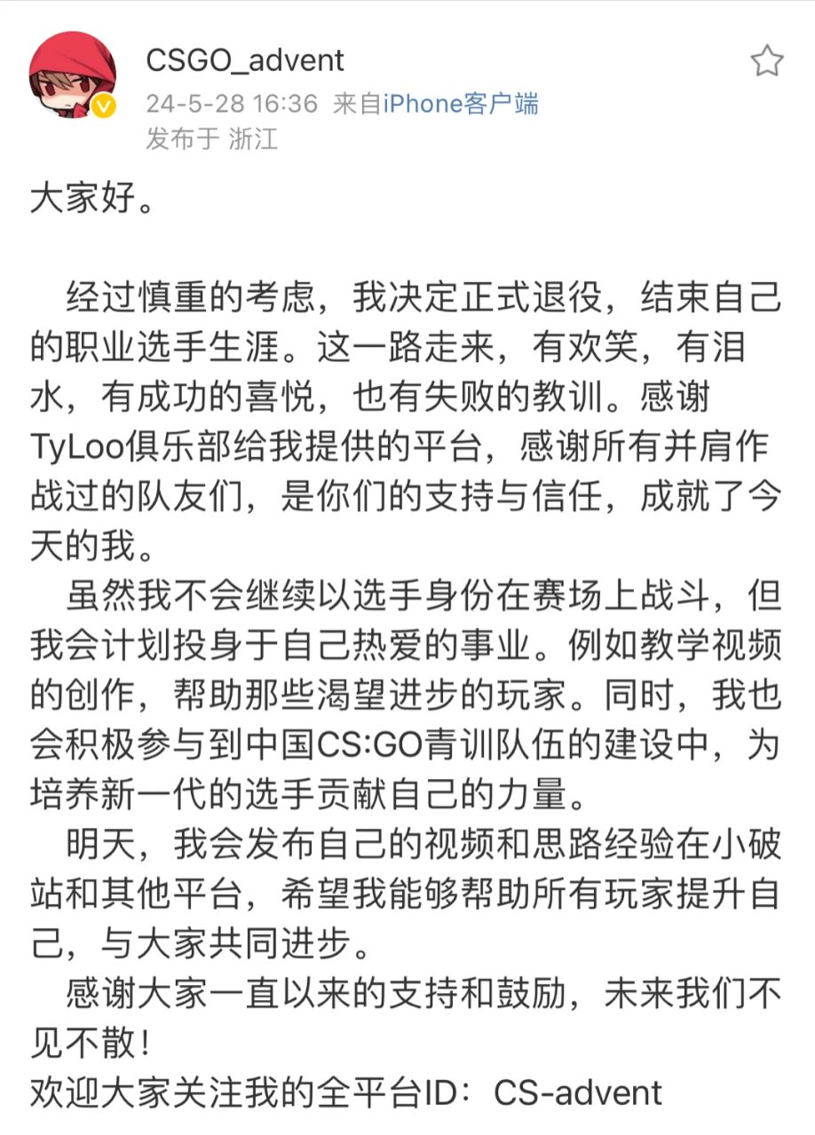 CS职业选手advent宣布退役:会积极参与到中国CS青训建设中