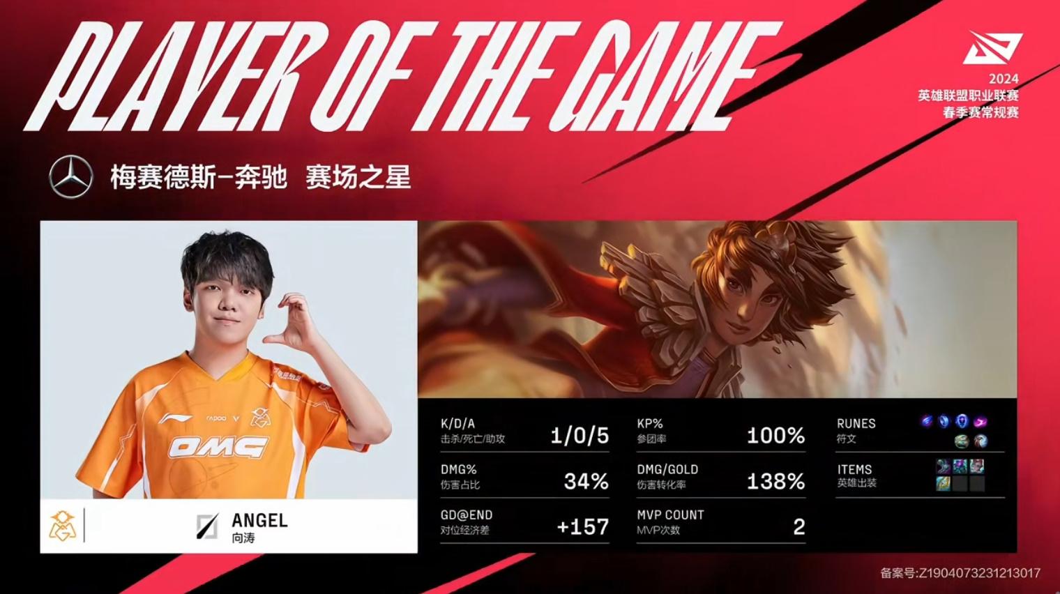 Angel岩雀砍下1/0/5战绩,拿到AL对战OMG第一局MVP