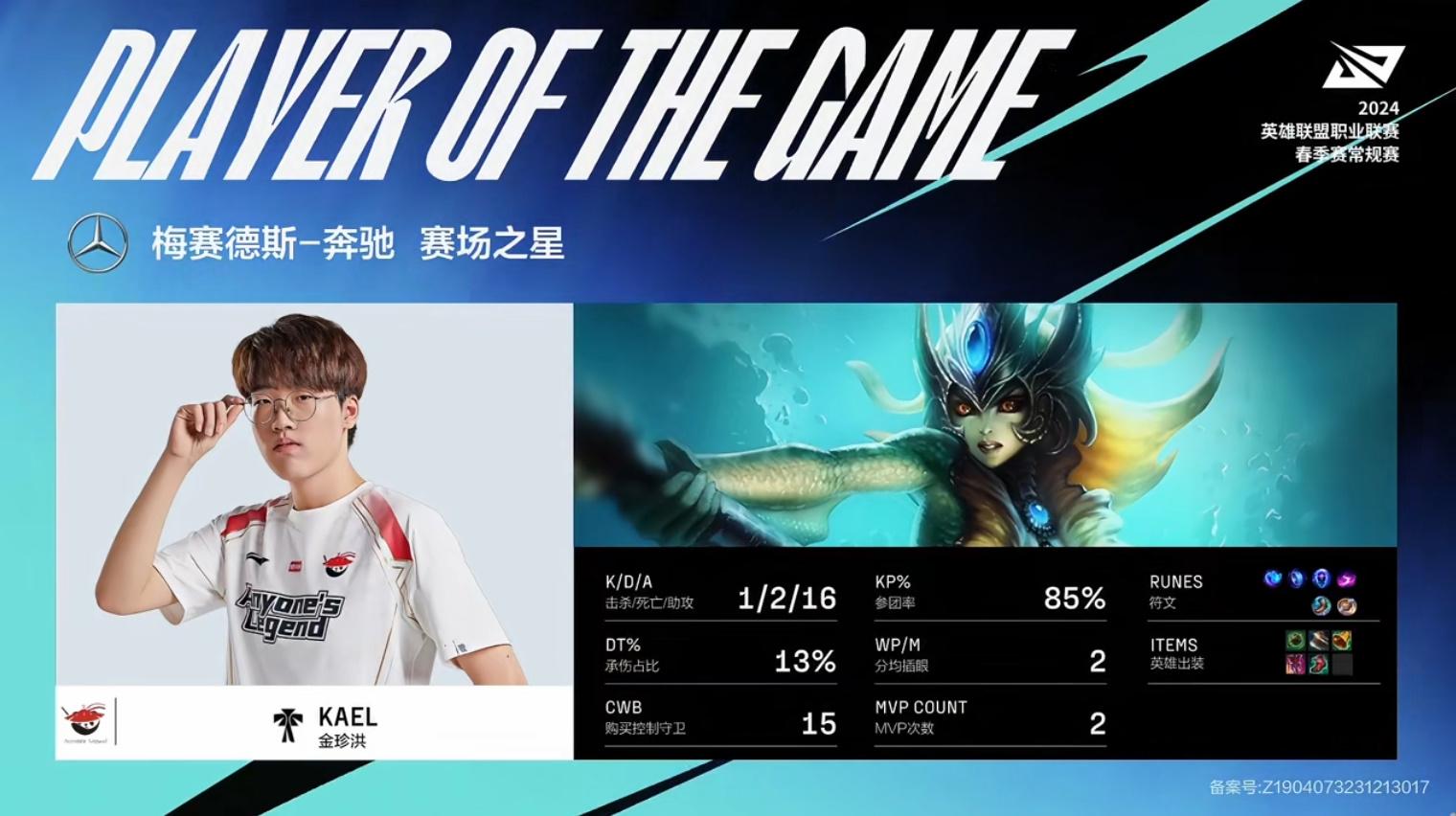 Kael娜美砍下1/2/16战绩,拿到AL对战OMG第三局MVP