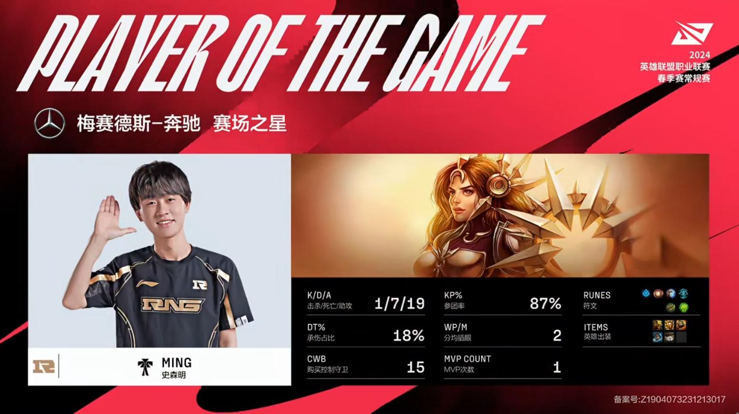 Ming蕾欧娜砍下1/7/19战绩,拿到IG对战RNG第一局MVP