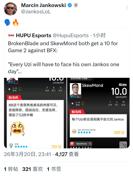 Jankos转发JR热评"每个Uzi都要面对他的Jankos":🗣🔥