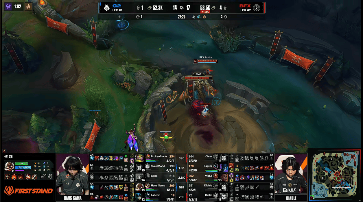 完全上头,BFX强行追击反被Hans Sama拿下三杀随后G2拿下小龙