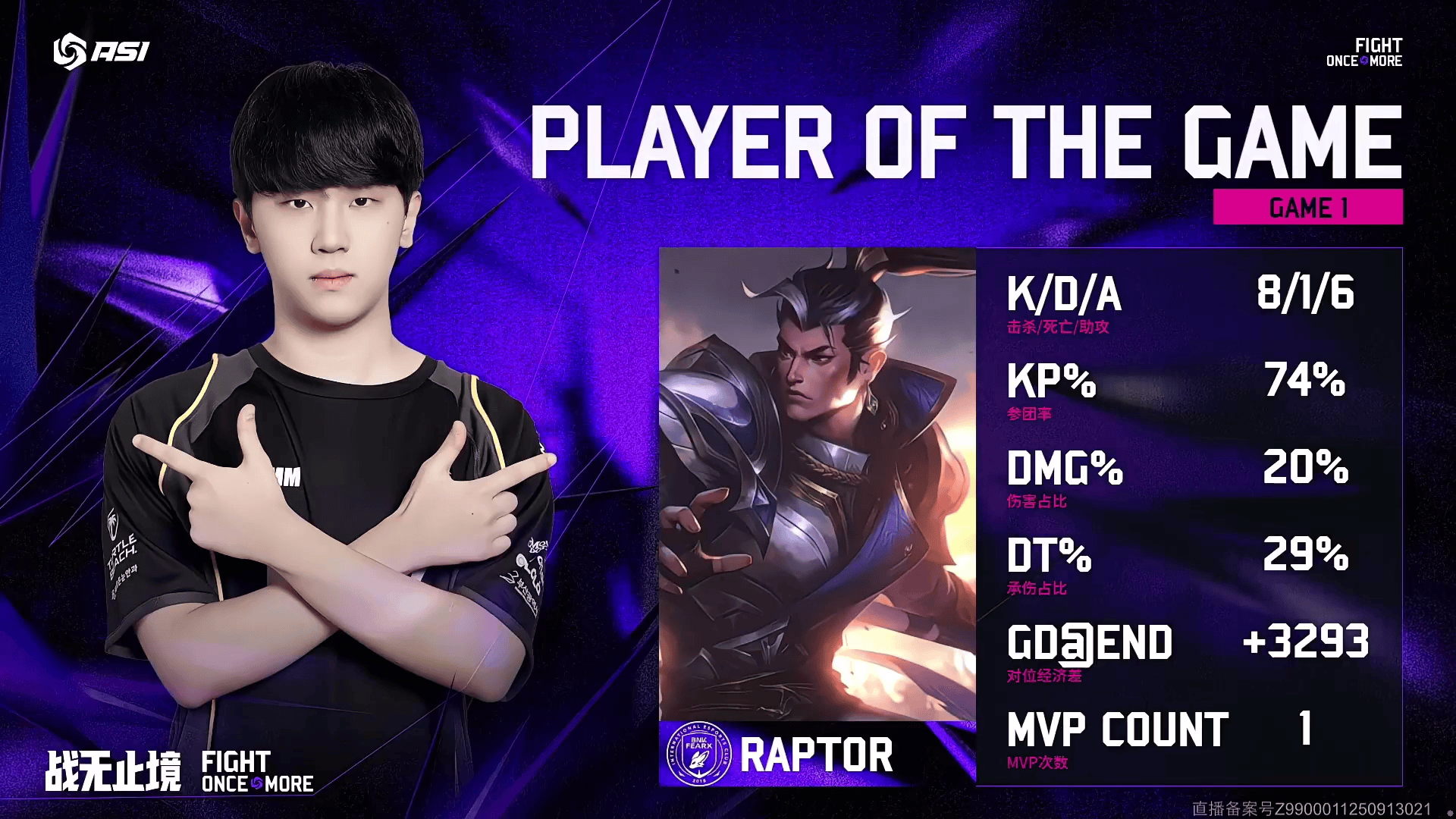 Raptor赵信砍下8/1/6的战绩,拿下BFX对阵WBG首局MVP