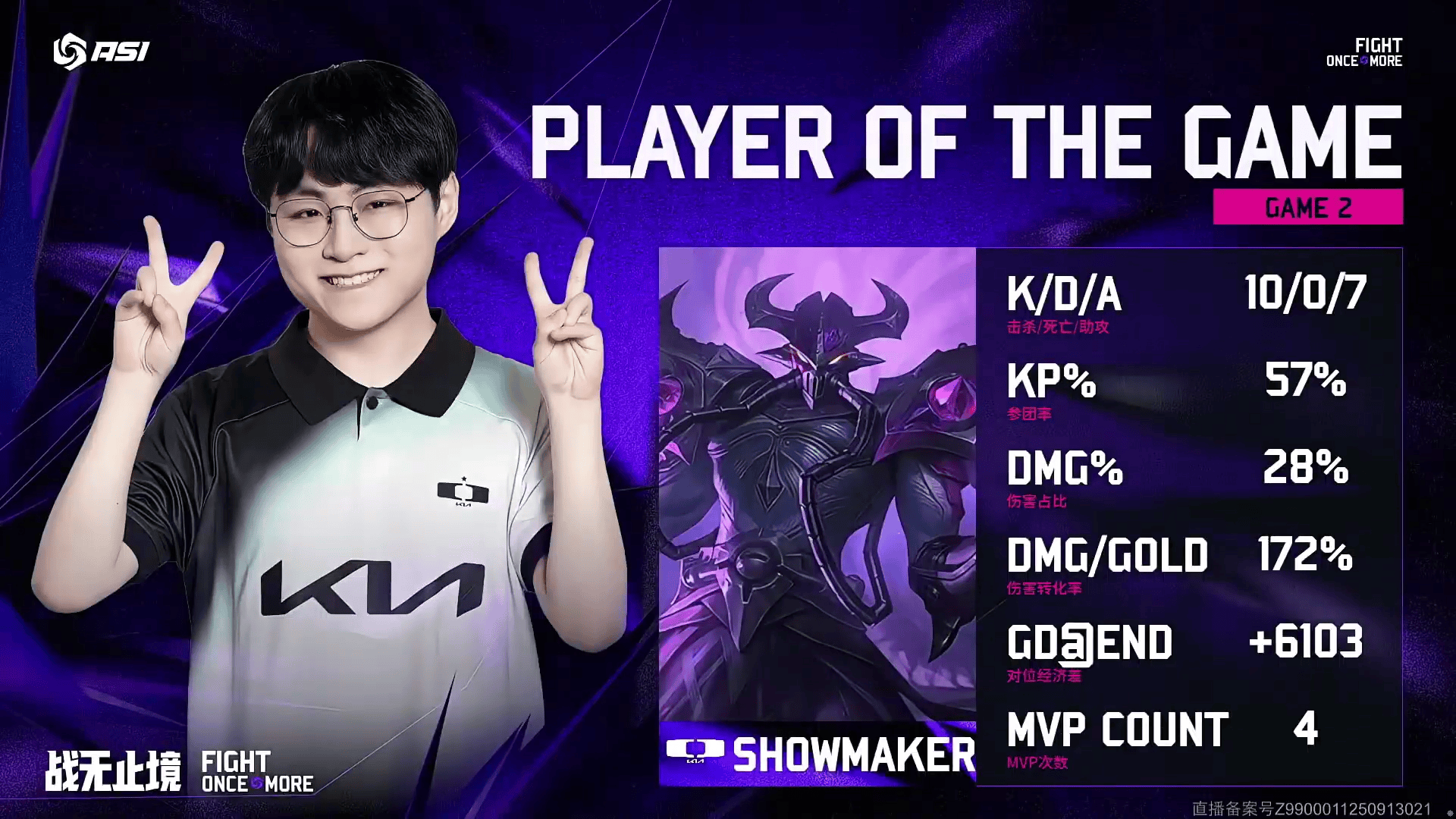 ShowMaker卡萨丁砍下10/0/7的战绩,拿下DK对阵NS次局MVP