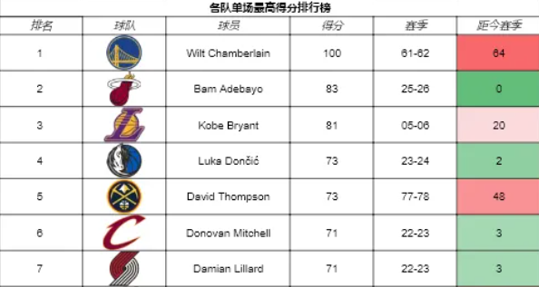 83分之后,各队单场最高得分记录排行