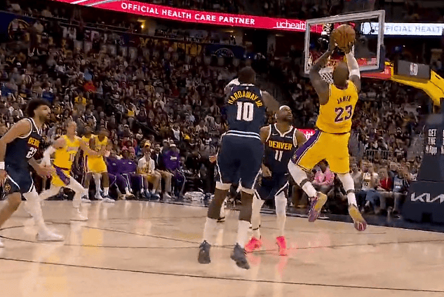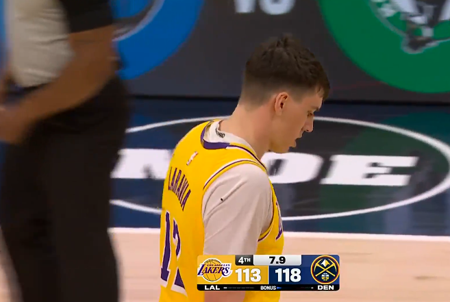 拉拉维亚自抛自接补篮打进,湖人还剩8秒落后掘金5分