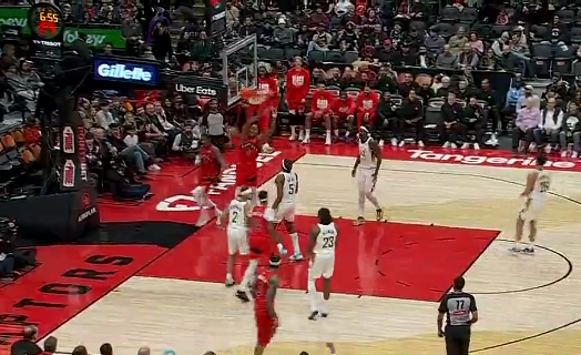 巴恩斯突破双手暴扣得手,猛龙打出一波23-8领先到13分