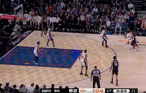 布伦森撤步三分不中,马刺首节比赛以21-22落后尼克斯